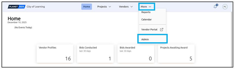 Sometimes, users may want to lock certain areas of documents to prevent editing. This is most commonly done for templates, but it can also be used for many other reasons. To allow users to lock content, those permissions must be assigned via the Admin menu. To access the Admin menu, click More and then Admin: