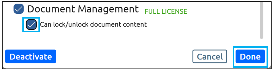 Scroll down to Document Management and select the checkbox to the left of Can Lock/Unlock Document Content, and then click Done: