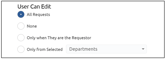 To designate what a user can edit, you can allow them to edit All Requests, None (not even their own), Only When They are the Requestor, and requests from Selected Departments: