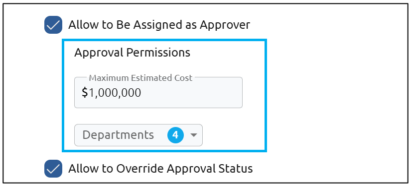 If you choose Allow to Be Assigned as Approver, you will see additional options available. Here, you can set the maximum estimated cost this user can approve and for which departments. Allow to Override Approval Status will allow the user to use the Status Override feature, letting them change the status of any request from any status to any other status, as long as they can view the request: