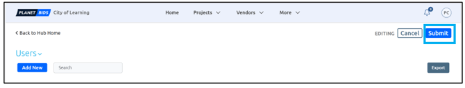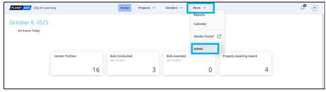 To assign a user privileges to complete certain tasks for Requests, click More, and then Admin from the PlanetBids home page:
