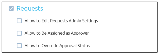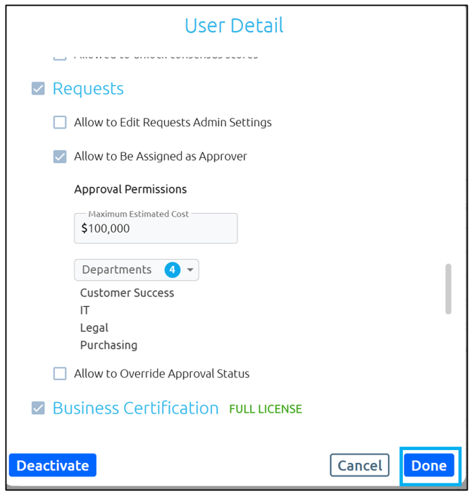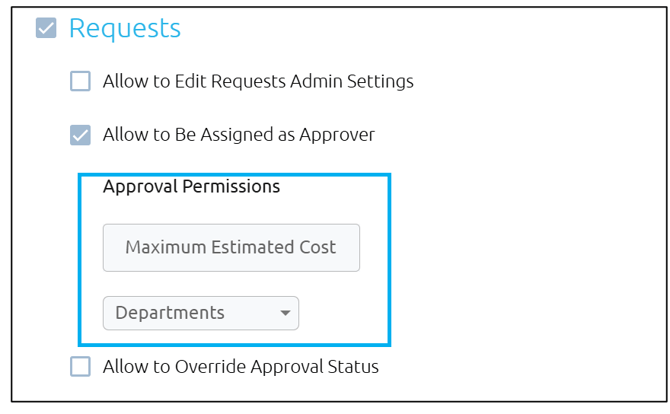 You will see three options to choose from. Select which option(s) you would like this user to have. Allow to Edit Requests Admin Settings will allow the user to configure the options of the standard Request form (upcoming functionality estimated to be available around November 2025). If you choose Allow to Be Assigned as Approver, you will see additional options available. Here, you can set the maximum estimated cost this user can approve and for which departments. Allow to Override Approval Status will allow the user to use the Status Override feature, letting them change the status of any request from any status to any other status, as long as they can view the request: