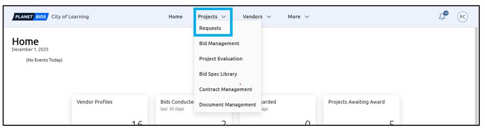 From the Home screen, click the Projects drop-down and select Requests: