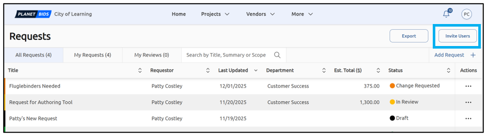 Note: the list will populate with current users on your PlanetBids side, who may or may not already be Requests users. This invite grants basic permissions to create Requests and edit their Requests. To learn more about assigning additional Requests permissions, please view Admin Settings for Requests.