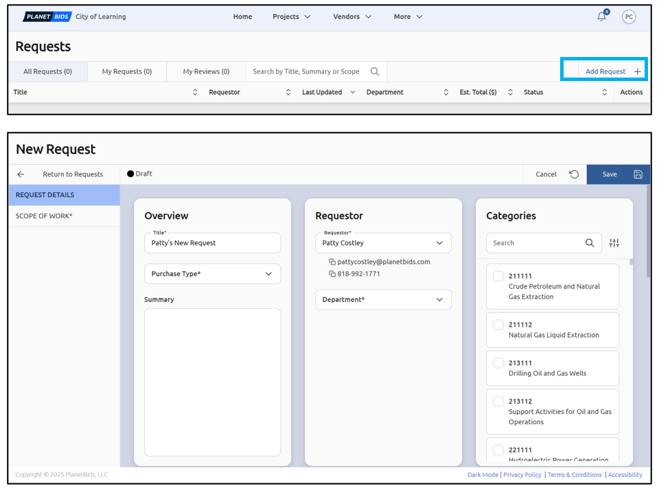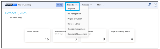 Sometimes, someone in your organization may need to submit a request to procure goods or services. The Request feature enables this in a streamlined and visible way. To make a request, click Projects from the top menu bar, then Requests: