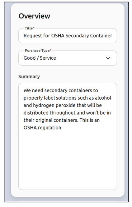 Start by providing an overview of your request, including the Title and Purchase Type (Good/Service, Public Works, Other). You can also fill out a description of your Request to give the approver more information: