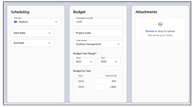 Move through the rest of your request, filling out any additional Scheduling and Budget information, as well as Attachments you may wish to share (quotes, estimates, line items, etc.):