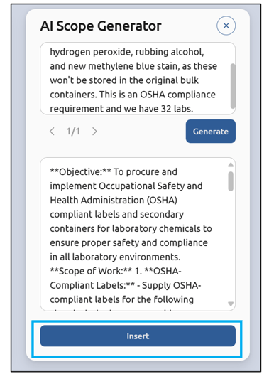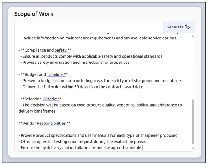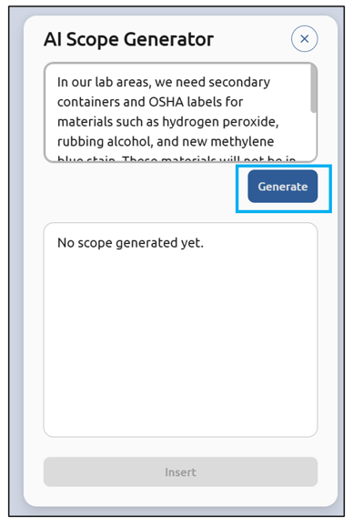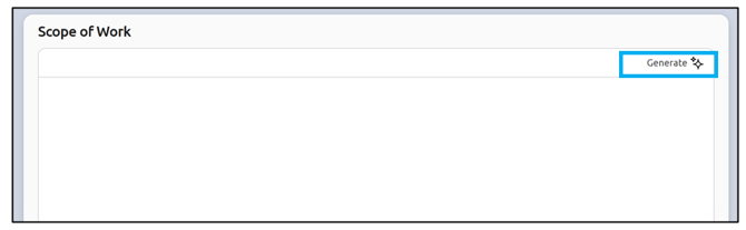 Here, you have the option to free-type or copy/paste your Scope of Work, or you may choose to use the Scope Generator tool. To use the tool, click Generate: