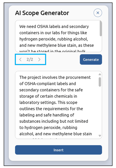 If you’d like to make changes, type your changes in the top box and click Generate again. This will create a second scope and preserve your first scope. You can toggle between the scopes by using the forward and back arrows: