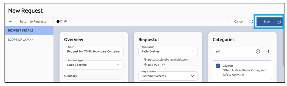 Once your Request is complete, click Save (you can also save the draft at any time throughout the process):
