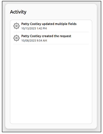 Once you save, a new card called Activity will appear. Think of this as an audit trail for your request: