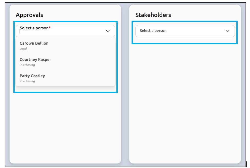 You can then select your Approver and any other Stakeholders who should be made aware of the request. Select the approver or stakeholder from the drop-down menu: