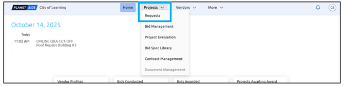 You will be taken directly to the request so you can review all of the information about what is being requested. You can also view your pending requests by clicking Projects then Requests from the top menu: