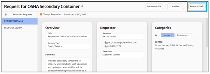 To make the requested changes, the Request must be in draft status. Click Revert to draft to do so: