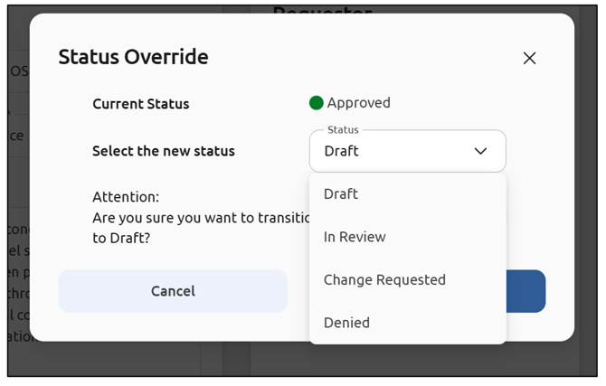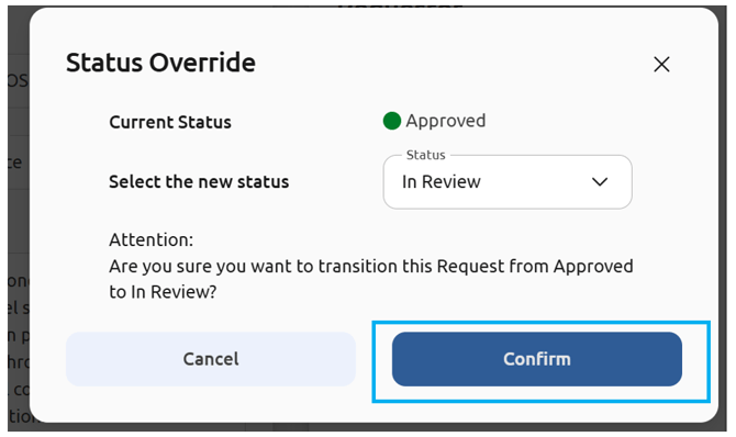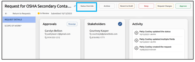 Sometimes, a user with Status Override privileges may need to override the Request's status. To do this, click Status Override: