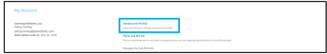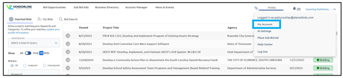 Keywords in your VendorLine profile help define the bid opportunities that automatically match to you, through both Matched Bids and the VendorLine Today daily email. To add or edit your keywords, click the drop-down under your business name in the upper right corner of your screen, and click My Account: