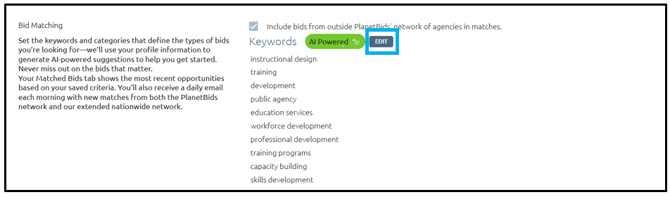 Scroll down to the Keywords section of Bid Matching, and click Edit: