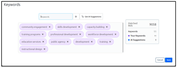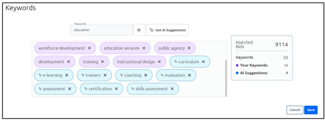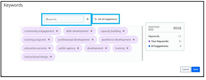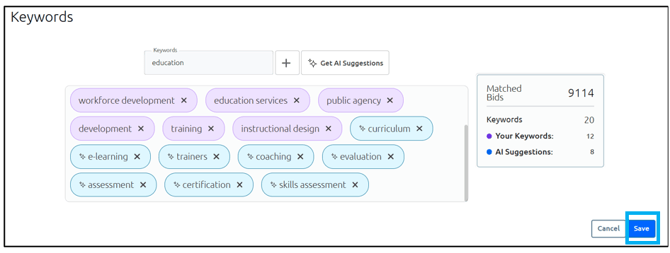 Your AI Suggestions will show up in blue boxes. Any keywords can be removed by clicking the X in the upper right corner of the keyword: