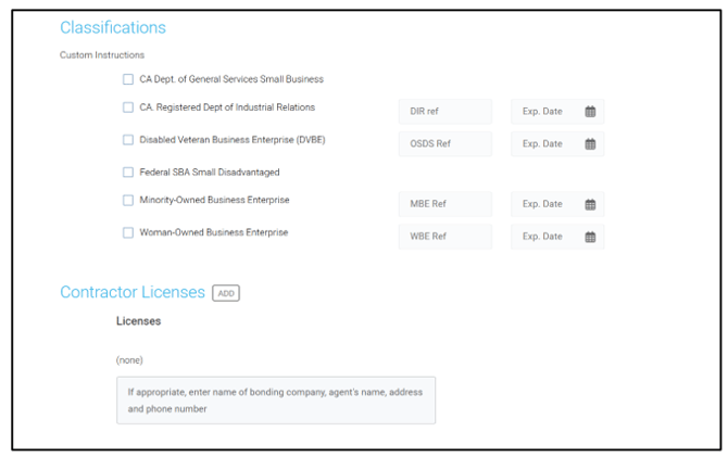 Add in any Classifications or Contractor Licenses . Classifications may be mandatory. Select Not Applicable if your company does not qualify for any of the classifications listed: