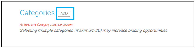 The final area to fill out is Categories. Adding categories can help you be matched with bid opportunities. To add Categories (up to 20), click Add: